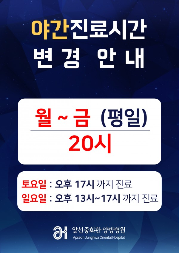 야간진료시간 변경 안내 페이지 정보 작성자 중화한방병원 댓글 0건 조회 289회 작성일 25-12-01 09:04 본문 안녕하세요 중화한방병원입니다. 야간진료 시간이 변경되었습니다. 참고하시어 착오 없으시길 바라겠습니다. 목록 답변 이전글[공지] 성탄절 및 신정 진료 안내 25.12.23 다음글[공지] 양방 10월 진료 안내 25.10.02