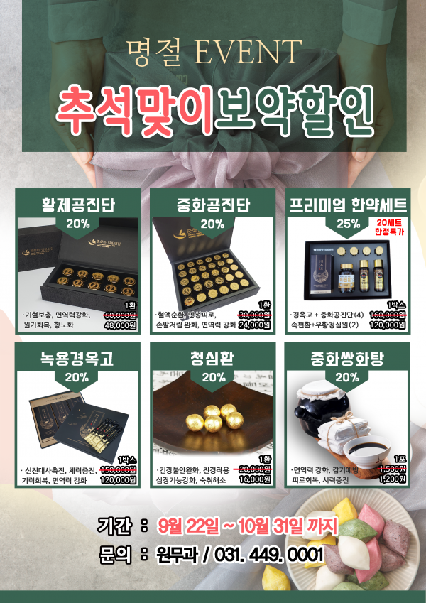 추석을 맞이하여 보약 할인 이벤트를 진행합니다.